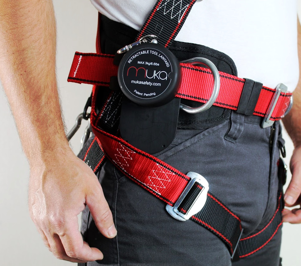 MUKA hält das Werkzeug nah an der Hüfte des Handwerkers und sichert es mit einem Drahtseil